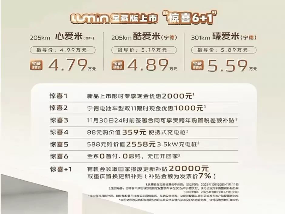 长安汽车旗下微型电动车Lumin迎来重要升级,正式推出珍藏版车型。新车共推出三款配置,官方指导价为4.99-5.89万元,限时优惠后价格下探至4.79-5.59万元,为消费者带来更具吸引力的购车选择。