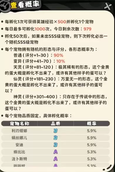 4、孵化机(抽卡系统)只能获得普通和变异两种形态的宠物。前期可以适当抽取变异SSS宠物,这类宠物资质最高。后期只需要用获取的免费抽卡券抽取即可。