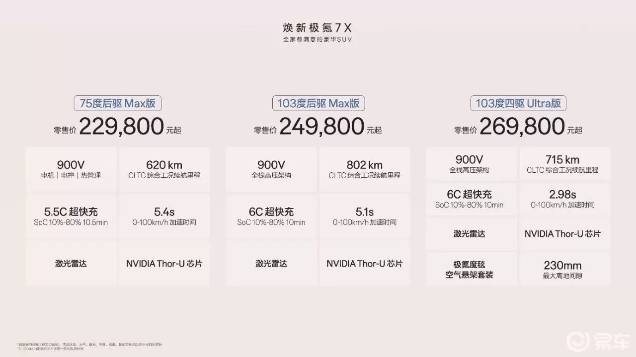 在当下主流纯电SUV市场同质化现象日益明显的背景下,极氪品牌以“全家都满意的豪华SUV”为定位,推出全新极氪7X车型。新车共推出三个版本,分别为75度后驱Max版、103度后驱Max版以及103度四驱Ultra版,最新指导价格区间为22.98万元、24.98万元和26.98万元。