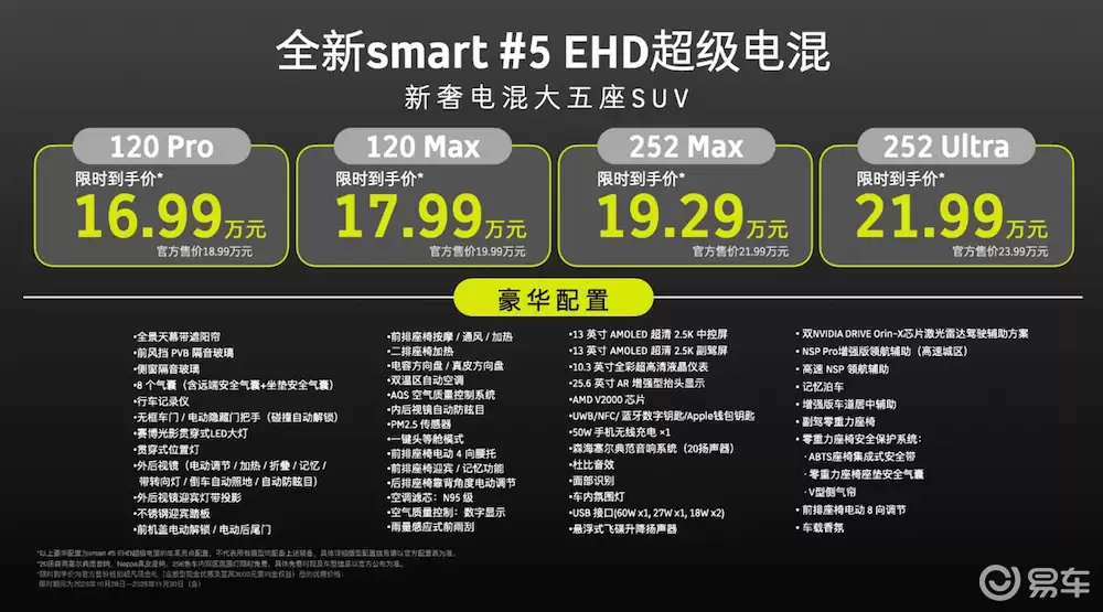 近日,smart品牌在杭州正式发布了旗下首款插电式混合动力SUV——smart #5 EHD,这款车型的推出标志着该品牌正式进入"纯电+插混"双技术路线的新阶段。新车共推出120 Pro、120 Max、252 Max和252 Ultra四个配置版本,官方指导价区间为18.99万元至23.99万元,在限时优惠活动期间,实际售价进一步下探至16.99万-21.99万元。