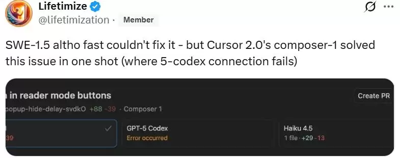 目前,已有一批开发者试用了两款模型。AI 专家兼博主 Simon Willison 在测试 SWE-1.5 后表示:“这款模型确实感觉非常快。与 Cerebras 合作进行推理,是一步非常明智的举措。”然而,也有用户在使用两款模型后称,“SWE-1.5 虽然速度快,但没能解决一个问题;而 Cursor 2.0 的 Composer-1 模型却一次性解决了该问题(在 5-codex 连接失败的情况下)。”