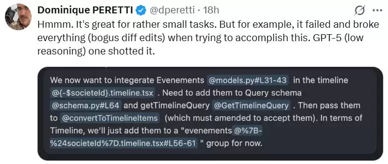 此外,还有用户反馈,“(SWE-1.5)它在处理小型任务时表现确实不错。但比如在尝试完成某项任务时不仅失败了,还搞砸了所有东西(出现了无效的差异编辑),而 GPT-5(低推理版本)一次就成功完成了。”