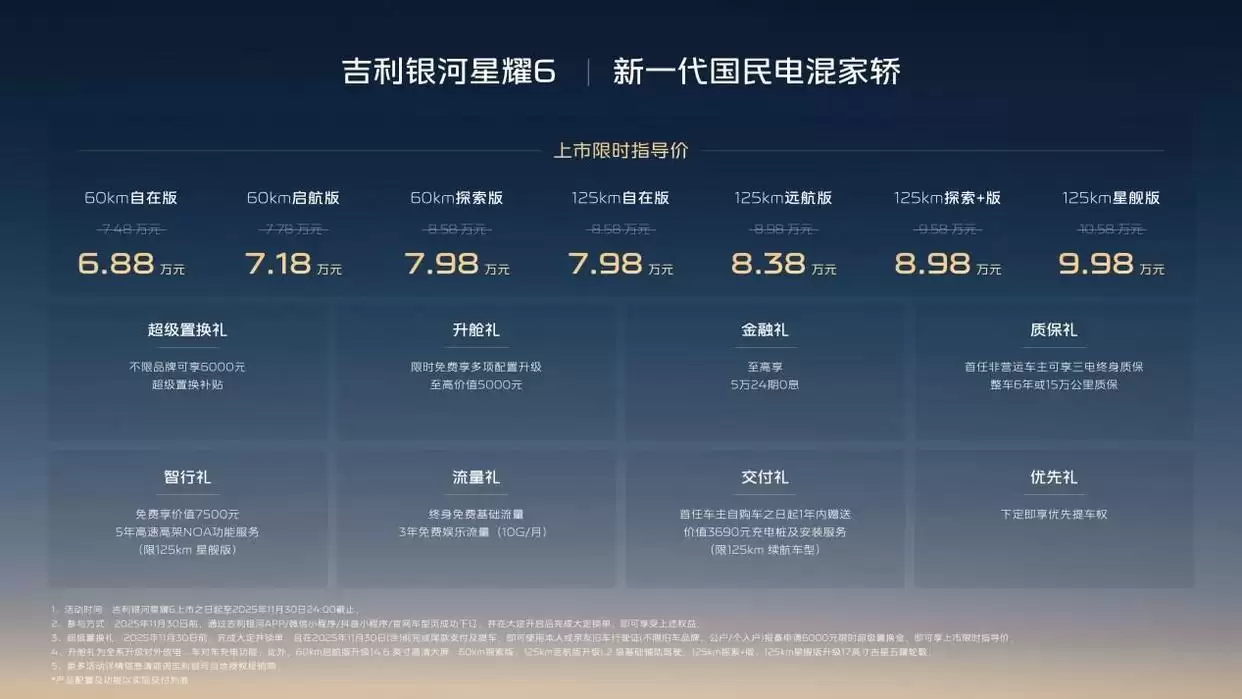 颜值固然是吸引消费者的加分项,但星愿6的综合实力远不止于此。吉利银河为其赋予了强劲的综合产品力,其中“以大打小”的定价策略尤为引人注目。星愿6拥有4.8米的车长和2.75米的轴距,以接近中型车的尺寸进军紧凑级市场。限时优惠价6.88-9.98万元(指导价7.48-10.58万元),不仅比同级燃油车更具价格优势,与秦PLUS Dm-i、启源A05等紧凑家轿相比,也总体持平甚至更胜一筹。