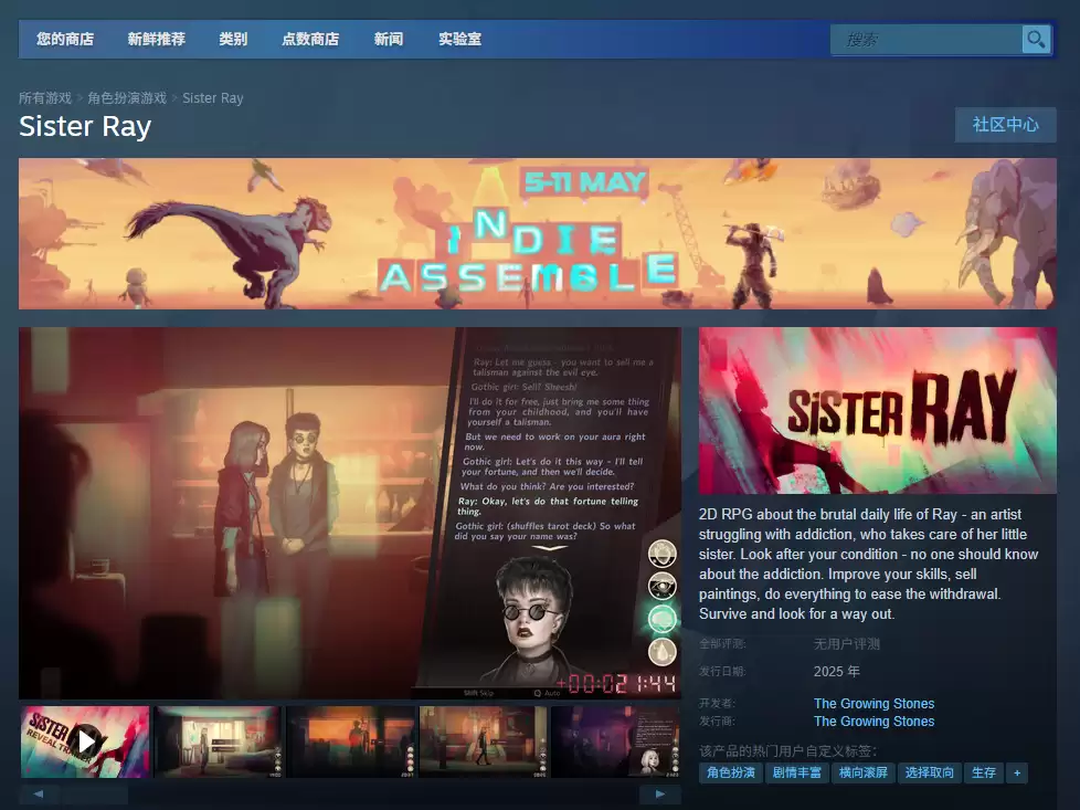 《Sister Ray》是由 The Growing Stones 工作室精心打造的一款横向滚动式剧情游戏。这款游戏的官方购买渠道正是 Steam 平台,只需进入其商店页面,就能了解到这款作品的所有详细信息。