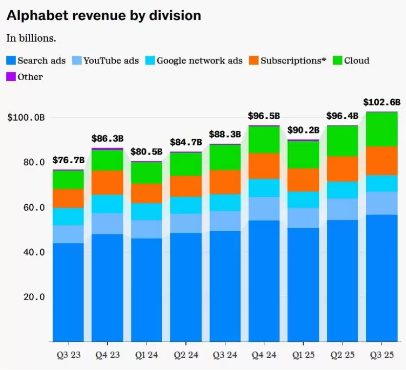 图注:谷歌2024年三季度-2025年三季度分部门营收