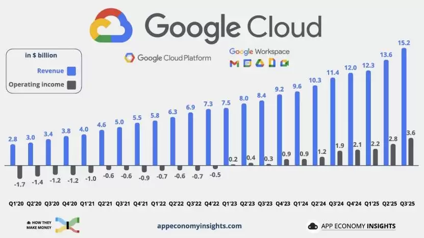 图注:谷歌云2020年-2025年三季度的营收与盈利贡献趋势图