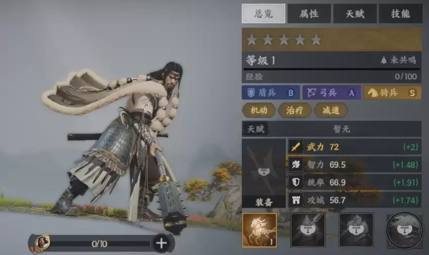 公孙瓒在游戏中定位为群攻型武将,不仅具备出色的机动性,还拥有治疗与减速的双重辅助效果。这使得他在战场上成为相对全能的角色,能够与任意阵容成员灵活搭配。该角色初始状态下武力值较为突出,虽然智力与统御能力处于中等水平,但整体属性相当均衡——既能在队伍中担任治疗角色,又可以亲自冲锋陷阵。