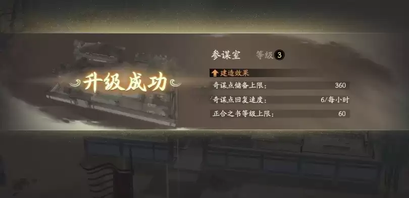 要想成功施展这些奇谋,玩家需要在学习后储备充足的奇谋点。而奇谋点的主要来源正是参谋室。随着参谋室等级的提升,奇谋点的恢复速度和存储上限都会相应提高。当建筑达到三级时,奇谋点存储上限将提升至360点,每小时恢复速度达到6点,同时合纵之书等级上限也可提升至60级。