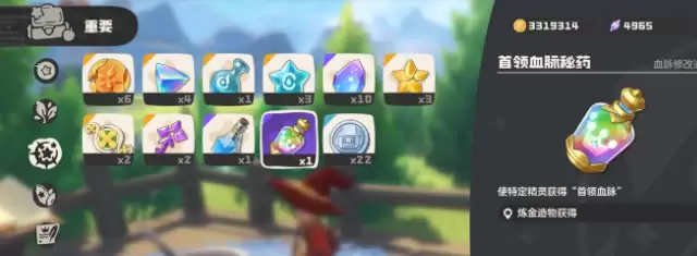 到达炼金塔后,找到基础炼金界面,将刚才获得的10个首领血脉全部放入材料栏。此时会消耗一些基础资源,合成之后就能获得首领血脉秘药——这是精灵血脉觉醒的核心道具,建议大家妥善保存。接下来就是给目标精灵使用秘药,比如经典的火神这类具备进化潜力的精灵。打开背包找到药物点击使用,然后选择要觉醒的精灵,只要符合进化条件就可以进行操作。