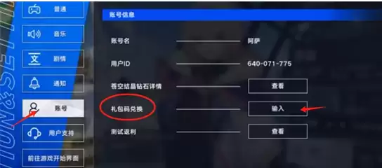 2、在设置菜单中找到账号选项,点击进入账号栏,右侧就会出现礼包码兑换入口,直接点击输入