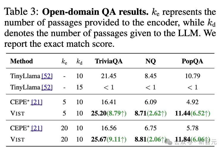 在开放域问答任务以及11个上下文学习基准任务上,VIST框架的表现显著优于基于文本编码器的压缩方法CEPE。