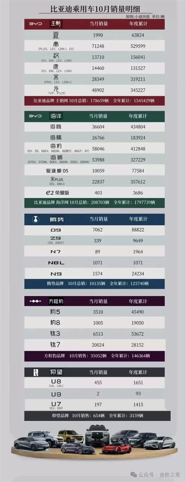 在高端市场方面,腾势品牌10月总销量达10,135辆,其中D9贡献7,062辆,年度累计88,822辆,持续在高端MPV领域占据重要地位。仰望品牌则以超豪华定位吸引小众市场,10月销量达654辆,其中U8月销455辆,年度累计1,651辆;U7月销197辆,年度累计1,415辆,展现出品牌在超高端领域的独特竞争力。