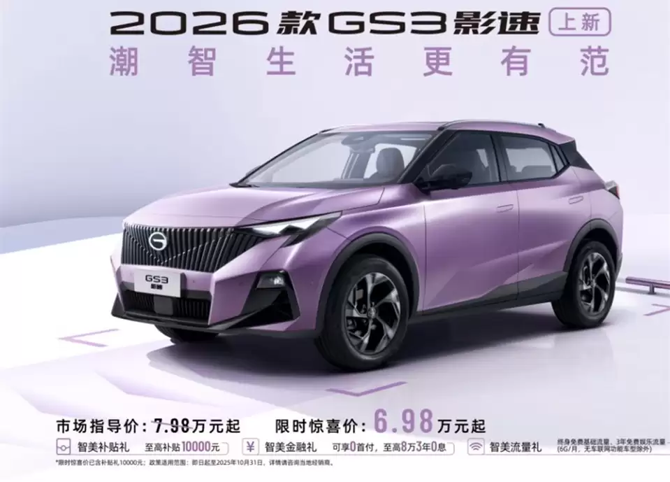 2026款传祺GS3影速此次推出了劲取版、劲享版和劲智版三大配置,官方指导价区间为7.98万至9.98万元,并且限时惊喜价下探至6.98万元起。相较于2024款车型8.58万元的起售价,在两年时间内,其入门价格降低了约1.6万元,同时配置还有所提升。这一举措精准地满足了年轻消费者预算有限,但又不想在车辆配置上妥协的核心需求,使其与同价位的吉利远景X6、长安CS35 PLUS等车型形成了直接竞争。
