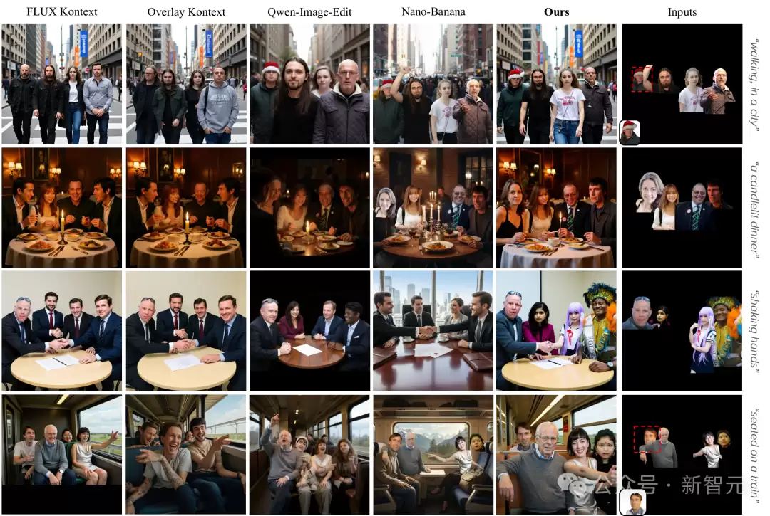 在四人同框的任务中,LayerComposer的生成质量显著优于FLUX Kontext、Qwen-Image-Edit、Gemini 2.5 Flash Image等模型,能在存在遮挡的情况下保持人物结构完整,并忠实地还原每个人物。