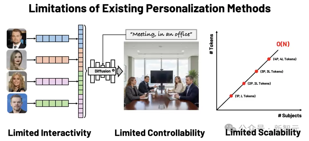 大型扩散模型(如Stable Diffusion)让我们能够从文字生成高保真图像。但当用户希望"生成我和朋友们在不同场景中的合照"时,现有个性化生成方法(如DreamBooth、IP-Adapter)仍然面临两个根本性问题: