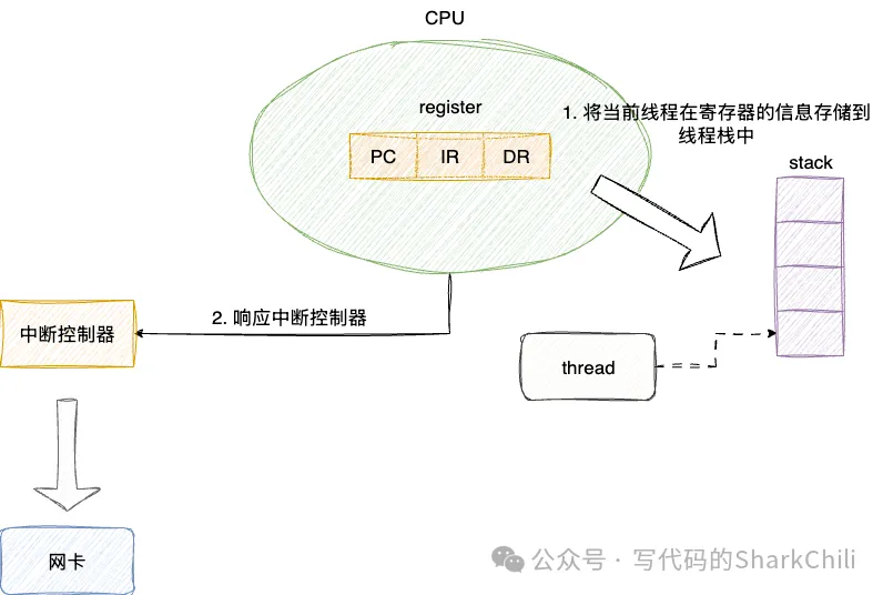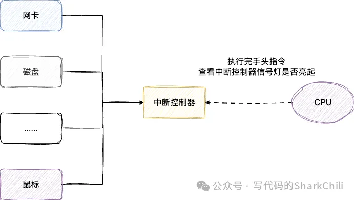在计算机发展初期,处理器除了执行必要的指令外,还需要与键盘、网卡、鼠标、硬盘等各类设备进行交互。由于这些外设执行速度与处理器存在巨大差距,为避免处理器因等待中断响应而降低效率,工程师们提出了中断响应机制。其实现方式颇为巧妙:所有硬件设备都与中断控制器绑定,当其他事件需要处理器调度执行时,通过中断驱动程序发送信号,处理器完成手头的指令后都会检查中断信号,一旦发现信号便立即作出响应: