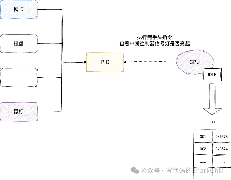 随着计算机的发展,需要交互的硬件设备越来越多,于是设计者引入了一个芯片专门处理不同的硬件中断控制——PIC(可编程中断控制器)即8259A芯片。PIC为每个硬件进行编号,也就是中断向量,同时为每个硬件中断配备对应的中断处理函数,最后将中断向量和处理函数地址进行映射,构建出一张IDT(中断描述符表)存放于内存中(CPU缓存空间有限),并通过IDTR(中断描述符表寄存器)指针进行管理: