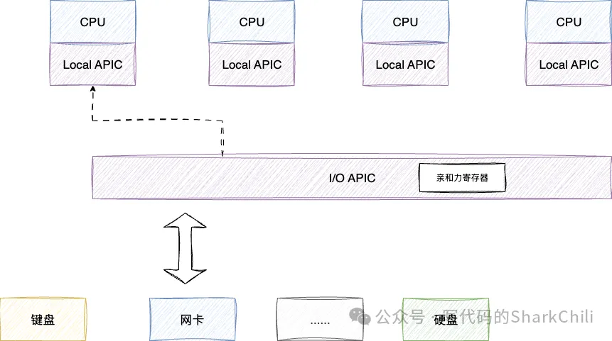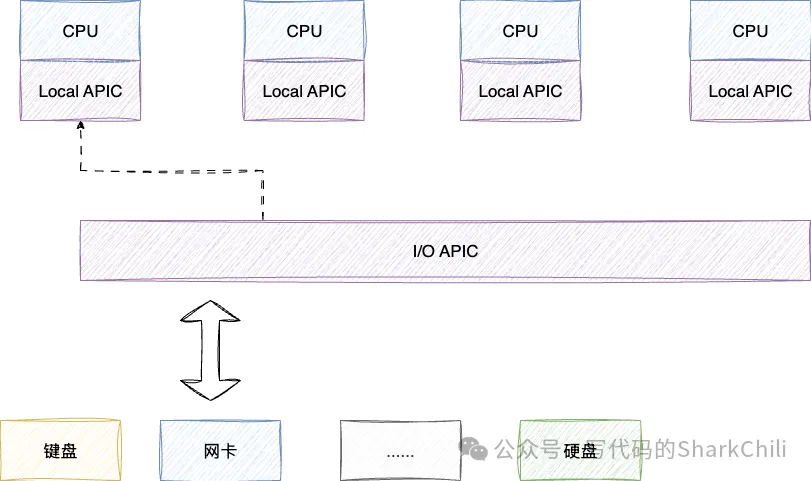 将PIC撤除,在每个CPU内置一个APIC,对应名为Local APIC,外部配备一个I/O APIC。基于此新架构,由I/O APIC处理外部硬件中断请求,并根据分发策略交给多核CPU中的某个Local APIC,通过Local APIC通知处理器处理中断。同时得益于Local APIC的存在,各个CPU之间也能进行相互的中断请求,这就是IPI(处理器间中断),进一步提升了多核系统内部中断响应的协同效率: