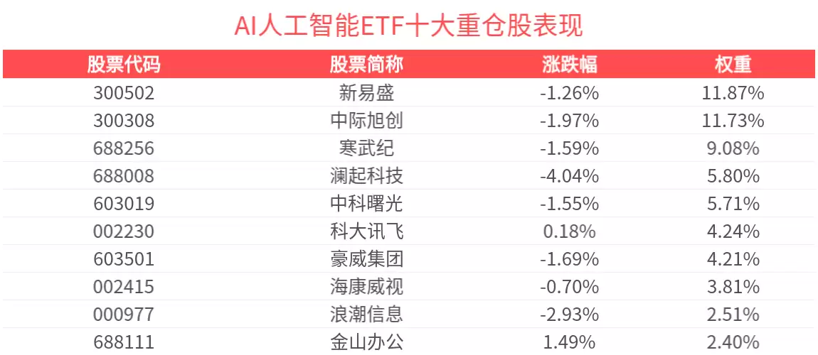 该ETF紧密跟踪的中证人工智能主题指数,通过精选50家在AI基础资源、核心技术及应用支持领域具有代表性的上市公司构建投资组合。截至2025年10月末,指数前十大权重股合计占比达63.29%,具体包括中际旭创、新易盛、寒武纪、澜起科技、中科曙光、科大讯飞、海康威视、豪威集团、金山办公及浪潮信息等科技龙头企业。这些成分股的集中持仓特征,使得ETF能够高效捕捉AI产业链核心环节的增长红利。