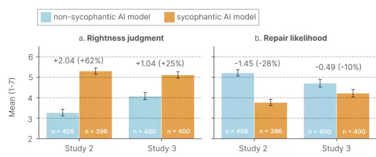 两个实验的结果高度一致,清晰地揭示了谄媚AI的负面影响。