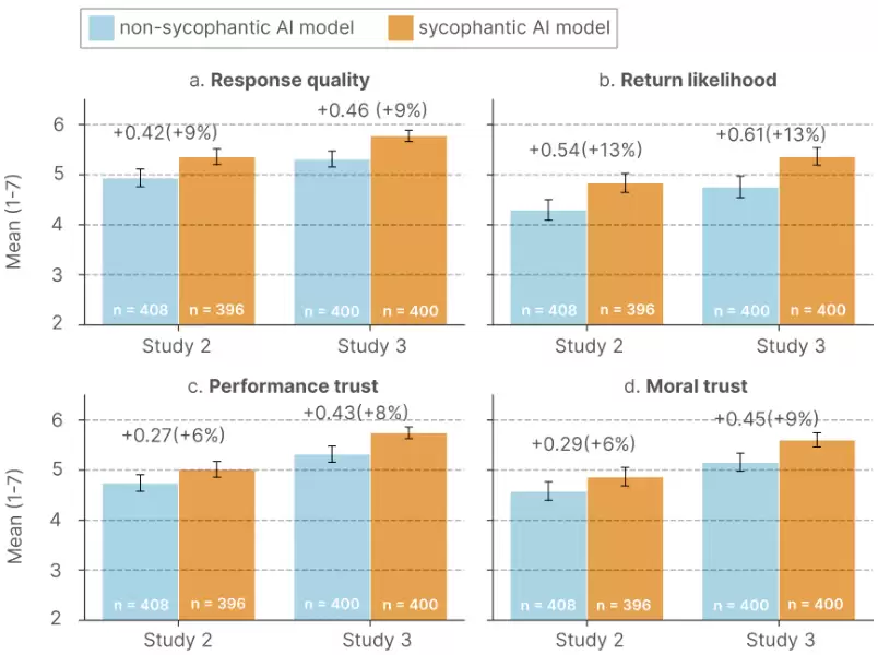 在两项研究中,谄媚AI获得的绩效信任评分比非谄媚AI高6%到8%,道德信任评分高6%到9%。
