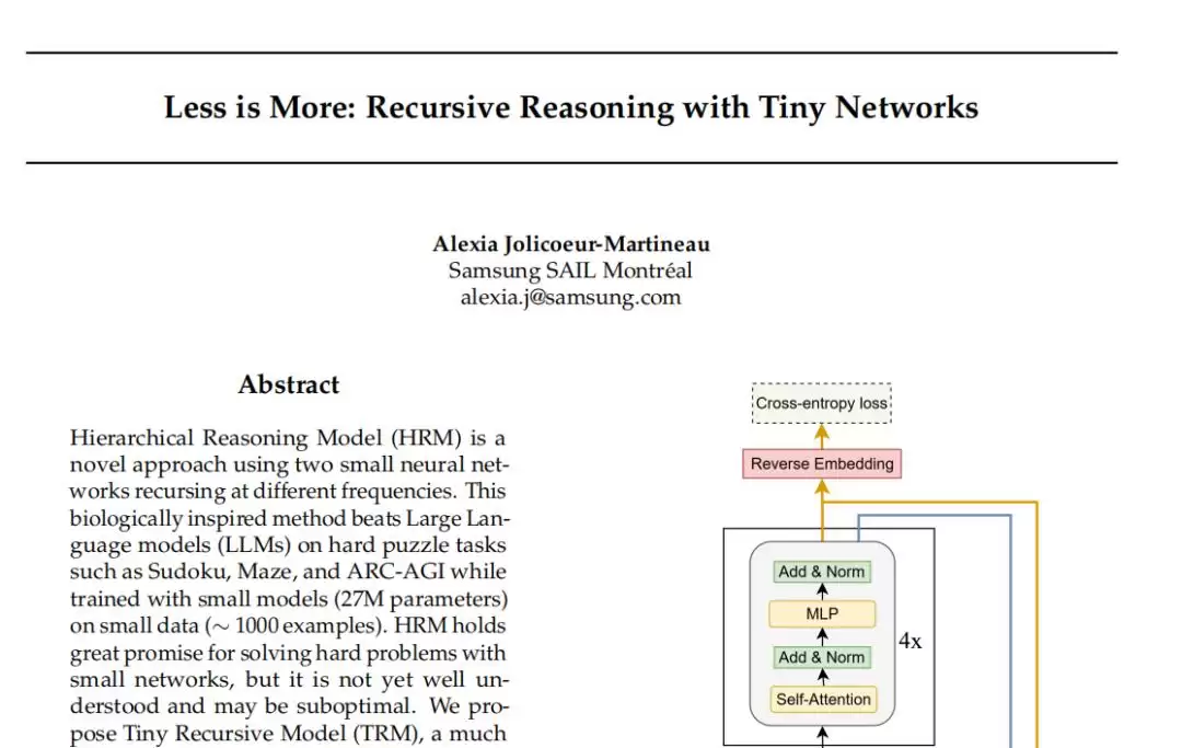 三星SAIL蒙特利尔实验室的研究团队最近发表了题为《Less is More: Recursive Reasoning with Tiny Networks》的论文,提出了一种名为Tiny Recursive Model(TRM)的创新递归推理架构。