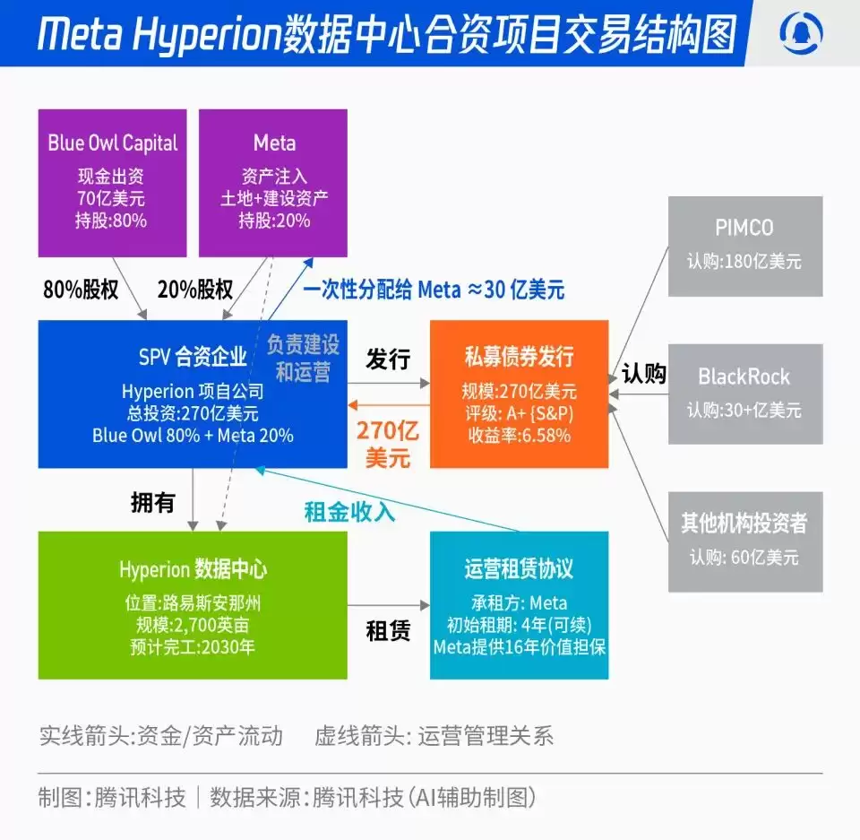事实上,在Q3财报发布之前,Meta在10月中旬就已宣布了总额270亿美元的“Hyperion”数据中心合资项目。交易结构十分清晰:Blue Owl出资约80%,Meta出资约20%,通过SPV发行约270亿美元的A+级债券,配套约25亿美元股权,锚定了PIMCO、BlackRock等长期机构资金。
