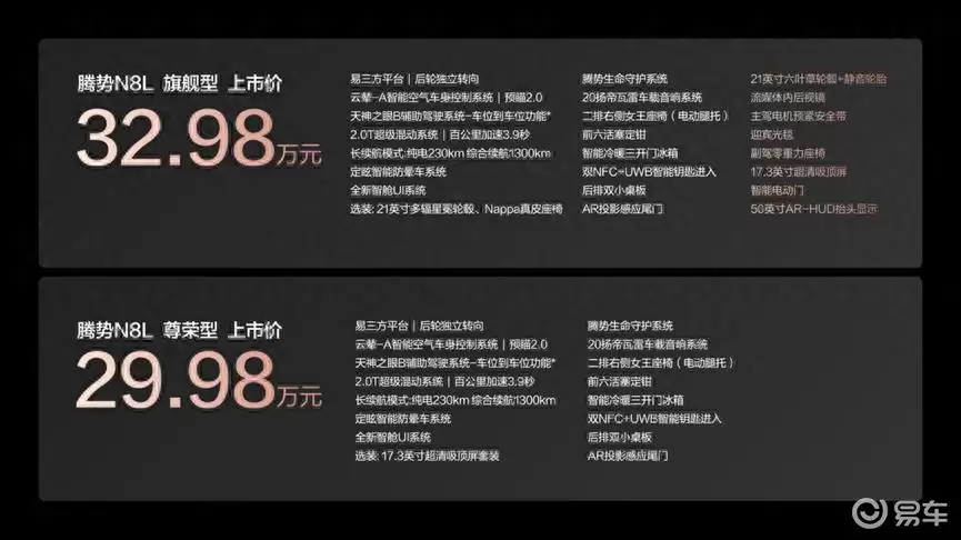 比亚迪旗下豪华品牌腾势正式发布全新“大六座安全豪华SUV”N8L,同步推出两款配置车型,官方指导价区间为29.98万元至32.98万元。这款新车以“安全家庭大六座、豪华移动大平层、智能科技大座驾”为核心设计理念,通过六大核心科技配置重新定义了家庭用车的价值标准。