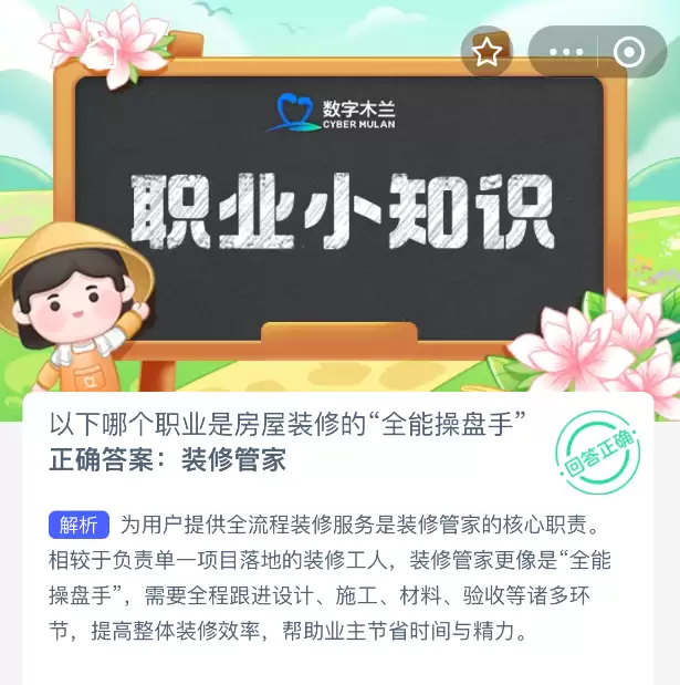 2025年支付宝蚂蚁新村答案:装修项目经理是全能操盘手