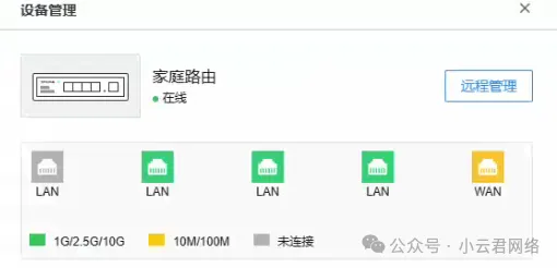 从图中可以清楚地看到,连接AP的LAN口都是千兆速率,而连接WAN口却只有百兆!由此我们初步判断,测速上不去很可能是因为网线质量存在问题导致未能协商到千兆速率。