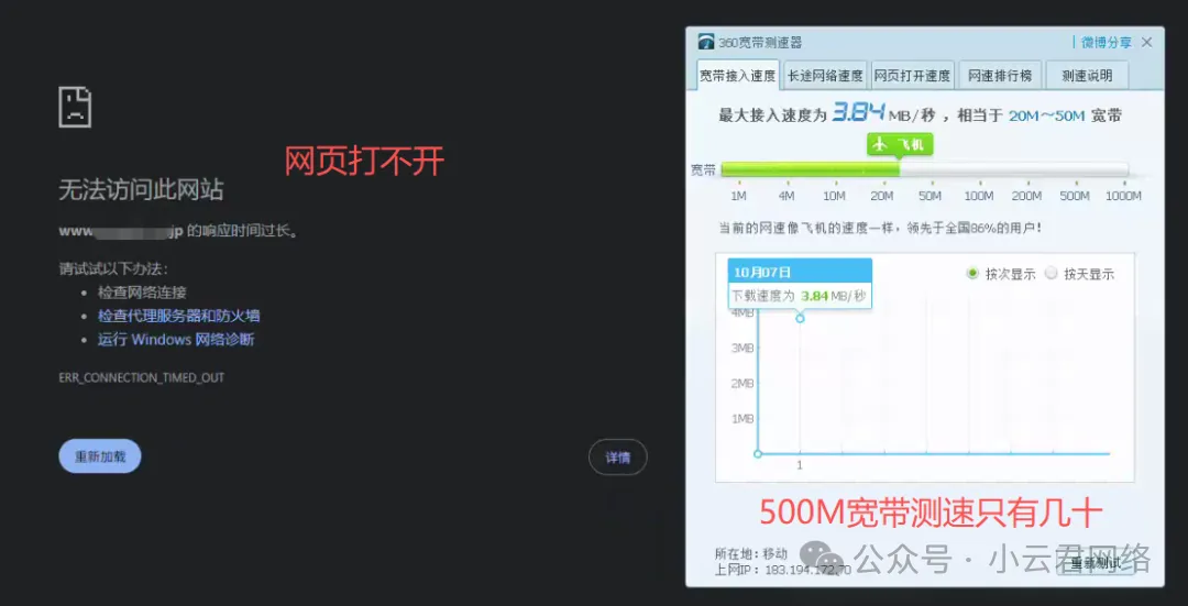 这个检查很简单,直接将电脑连接到光猫上进行测速即可。测试结果显示速率符合预期,能达到500M带宽。