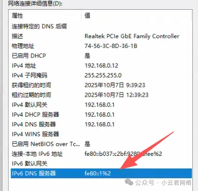 立即发现了问题所在,PC竟然走的是fe80::1的IPv6解析,说明电脑拿到了IPv6 DNS地址。打开网络适配器查看: