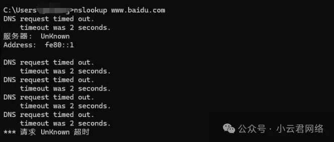 我们需要了解一个关键点,网页打不开往往和DNS解析异常有关。因此我们可以使用nslookup命令来确认域名是否能成功解析: