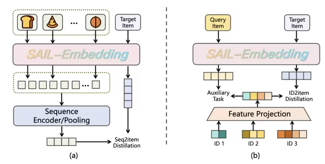 序列到物品蒸腾:通过多维度的用户兴趣序列筛选机制,利用具有正向交互行为的历史观看序列与目标视频的关联,让模型学习用户兴趣的时序连续性;ID到物品蒸腾:对齐推荐系统中的多元化ID表征嵌入,将用户偏好信号(如点击、关注等)融入多模态特征,使嵌入结果更贴合推荐侧应用需求。