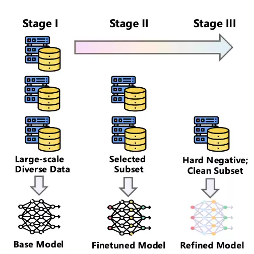 SAIL-Embedding的训练并非单一阶段,而是构建了一套覆盖“基础能力-任务适配-推荐增强”的多阶段体系,确保模型既能准确理解内容语义,又能贴合真实推荐场景需求: