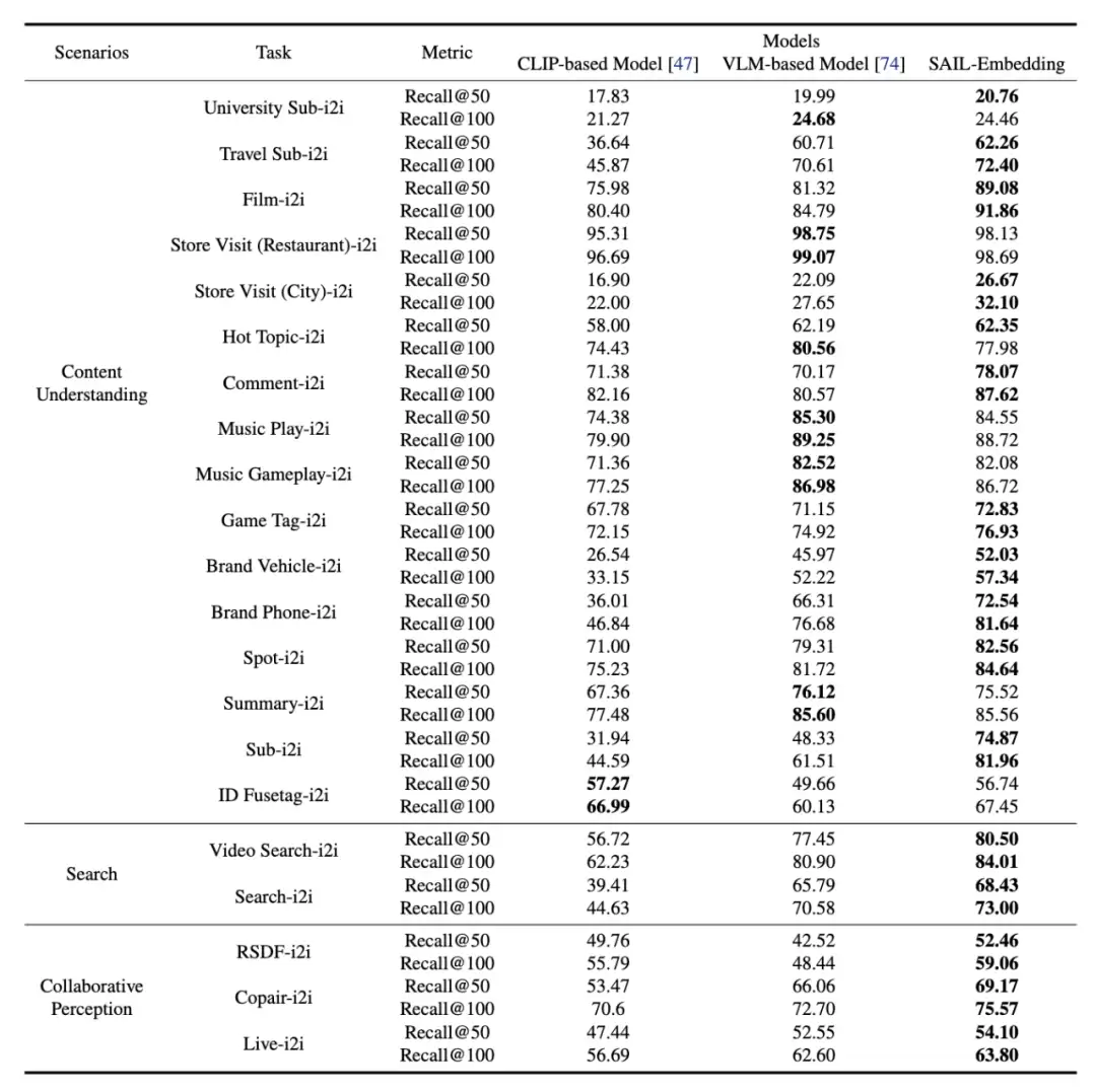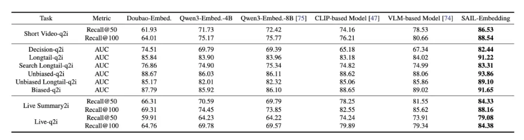 在21个涵盖内容理解、搜索推荐等场景的测试中,SAIL-Embedding显著优于CLIP-based模型与VLM-based方案。