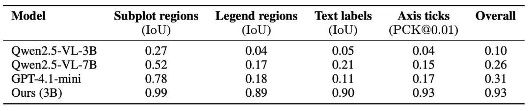 在合成与标注评测集上,微调后的grounding在子图区域、图例区域、文本标签与刻度点的IoU/PCK指标均较基础模型有显著提升。