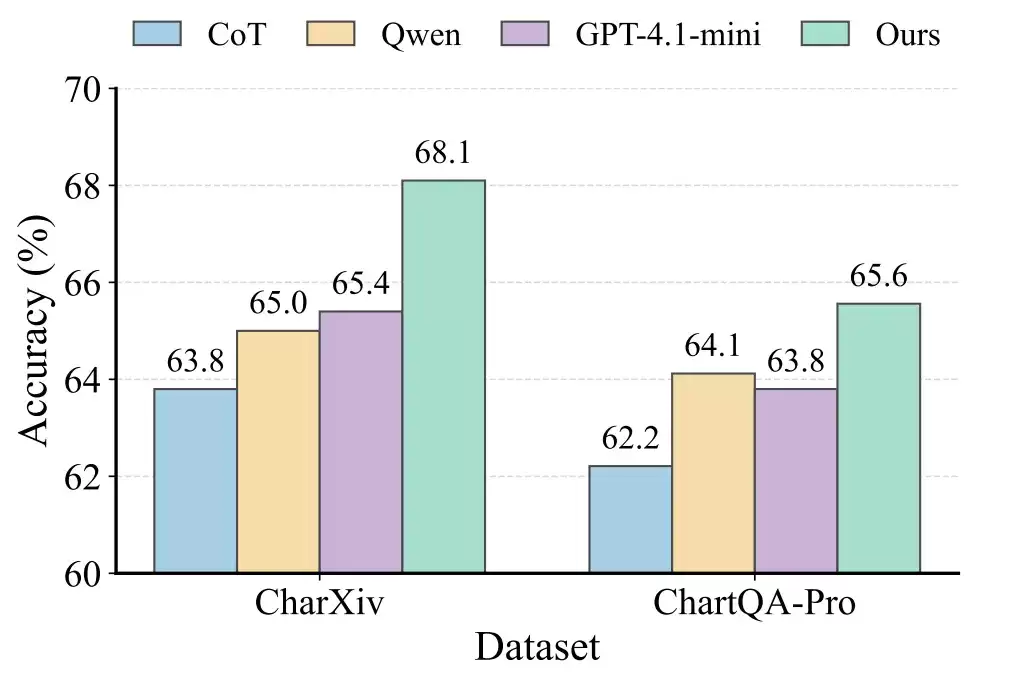 "视觉链式推理"虽然尝试插入中间图像线索,但受制于低保真的图像处理和简单的线性处理链条,这类方法在应对复杂真实问题时效果有限。这一局限性在更贴近真实场景的CharXiv、ChartQAPro等基准测试中得到了明确体现。