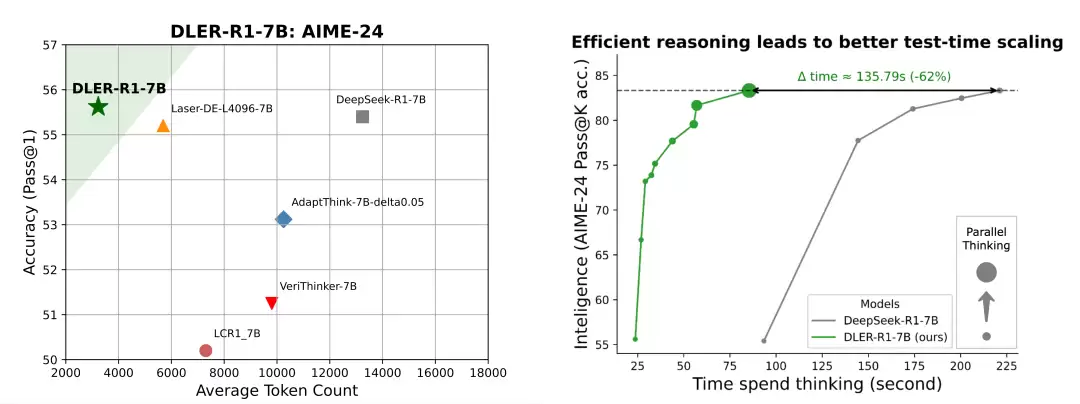 DLER不仅实现了更简短的输出,更是从本质上提升了每个token的信息密度。在相同的推理时间内,相较于传统推理模型只能生成一条冗长的推理链,DLER模型能够并行生成数十条精炼的推理路径,最终准确率比DeepSeek-R1高出近50%。这一实验结果也意味着高效推理才是测试时扩展的关键所在。