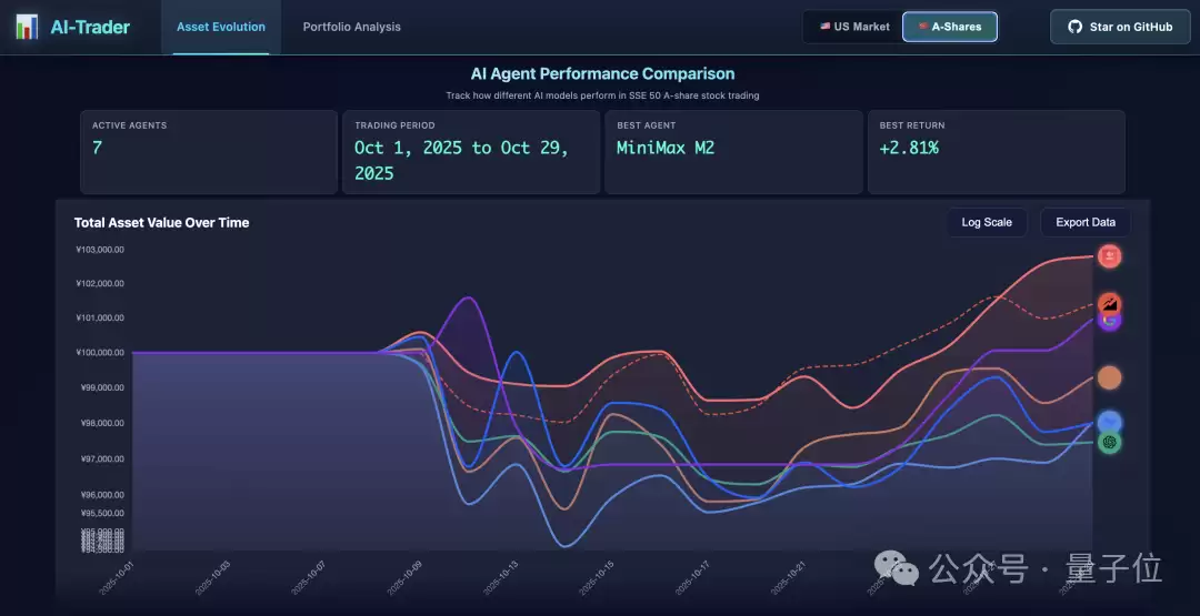 面对现实任务,M2表现得非常扛打,在香港大学的AI-Trader模拟A股大赛中拿下了第一名,20天用10万本金赚了将近三千元。