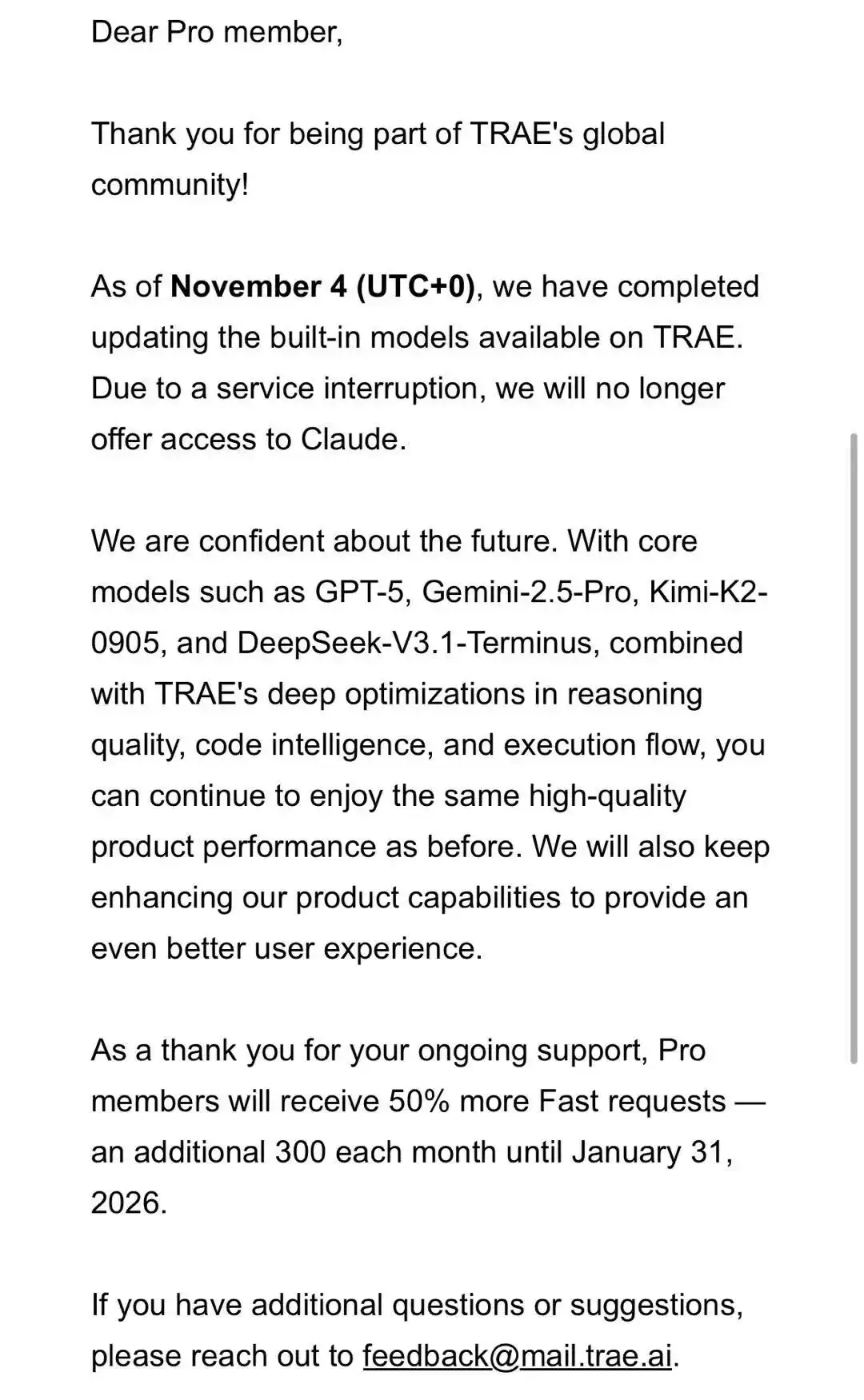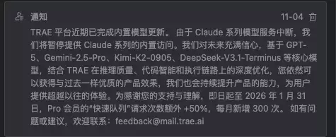 Trae同时表示,对未来发展保持信心,平台将聚焦GPT-5、Gemini-2.5-Pro、Kimi-K2-0905、DeepSeek-V3.1-Terminus等核心模型,持续优化"推理质量、代码智能与执行流程",以提升产品使用体验。