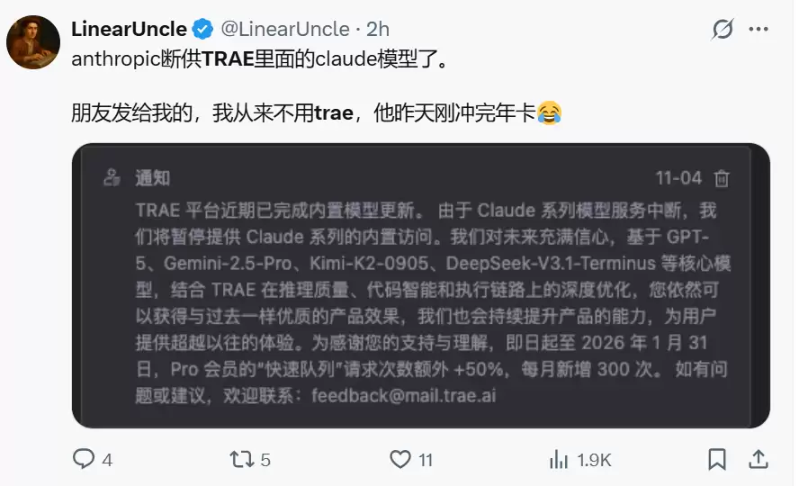 11月4日,AI工具平台Trae向用户发布公告,平台内置模型已完成更新,但将不再支持对Claude的访问。公告原文引用如下:"Due to a service interruption, we will no longer offer access to Claude."。