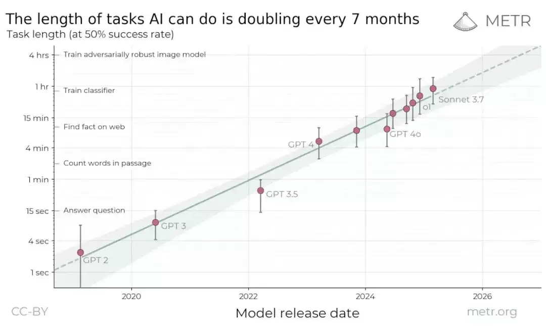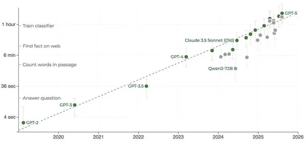 他们的思路很直白:不再只看模型答题对错,而是衡量它们能自主完成多长时间的真实任务。