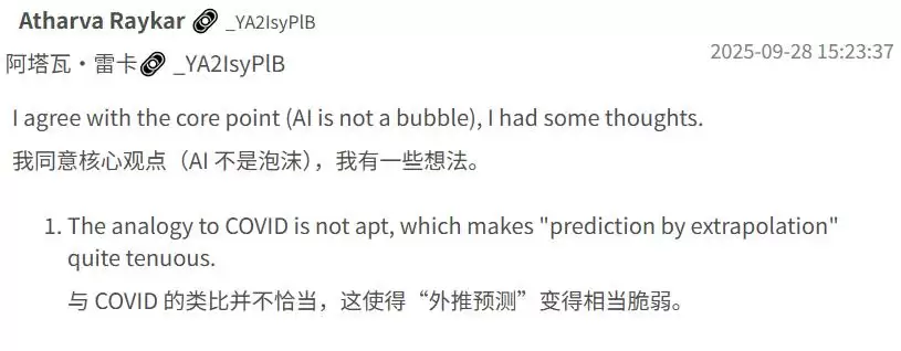在Julian的博文下,不少读者认同「AI没有泡沫」,但也有人提出尖锐的质疑。