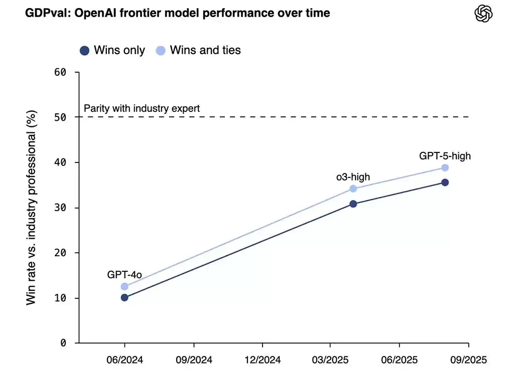 OpenAI GDPval评测结果(2024–2025)。纵轴为模型在真实职业任务中的胜率(对比有多年经验的行业专家),深色为纯胜率,浅色为胜或平局。可以看到GPT-5已逼近「行业专家水平线」。
