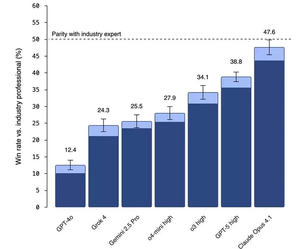 这些任务由平均14年经验的行业专家设计,再交给模型去完成,最后由盲评打分:只看结果,不看作者是谁。