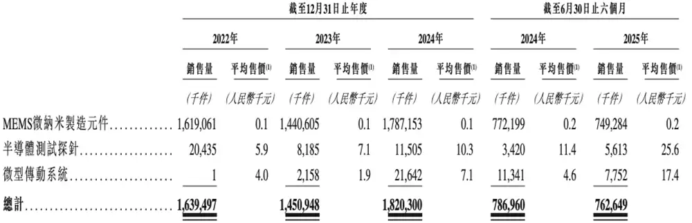 2025年上半年,公司售出7.49亿件MEMS微纳制造元件、561万件半导体测试探针、775万件微型传功系统。