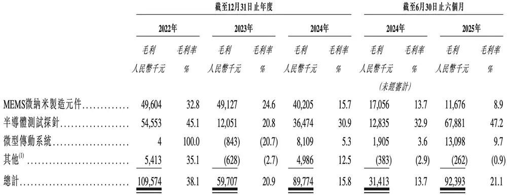 2025年上半年,MEMS微纳制造元件、半导体测试探针、微型传功系统三大业务板块的营收贡献占比分别为29.8%、32.8%、30.7%。