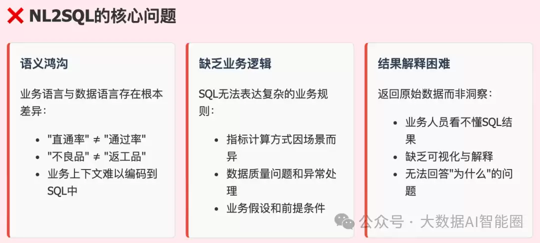 “自然语言转SQL,让业务人员直接问数据”——听起来多么动人。但现实是,当你问“上周A线的良品率为什么下降了”时,系统给你的是一堆看不懂的SQL代码,或者更惨——直接报错。