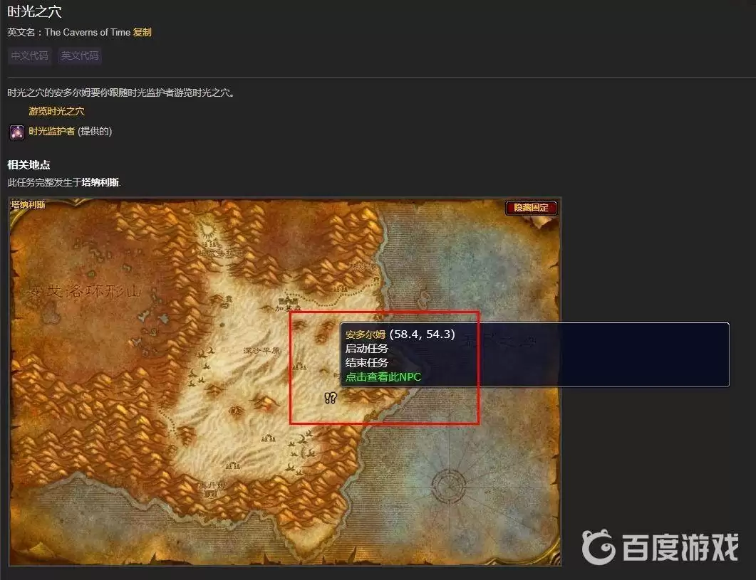 时光之末副本位于时光之穴区域内,具体位置在塔纳利斯地图右侧。玩家可以与时间管理者安多姆(坐标58.4,54.3)对话,让他带领你飞往时光之穴内部。